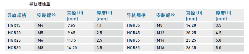 為防止切削粉末或異物經(jīng)由螺栓孔侵入滑塊內(nèi)部影響精度,客戶必須在安裝導(dǎo)軌時將螺栓蓋打入螺栓孔內(nèi),每支導(dǎo)軌出廠時皆配有螺栓蓋。