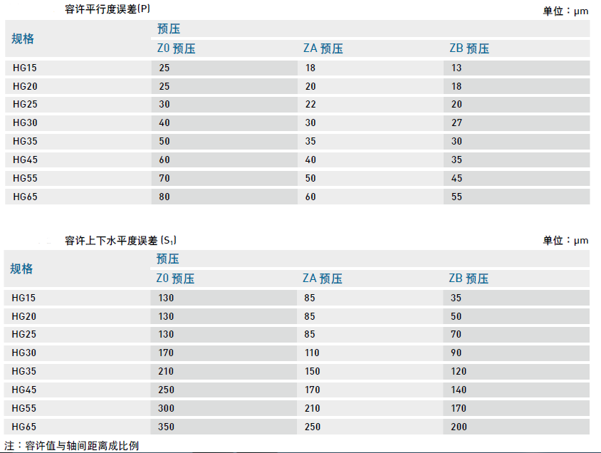 HG系列為圓弧兩點接觸式直線導(dǎo)軌,其自動調(diào)心的特性可以吸收安裝面的些許誤差而不影響直線運動的順暢性;下表中注明了安裝平面的容許誤差值: