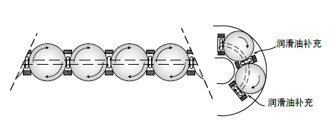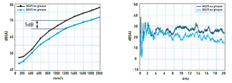 利用同步聯(lián)結(jié)器可使?jié)L珠均勻等間隔的排列,滾珠與滾珠間的相互撞擊金屬聲消失,尖銳的高頻聲音強度有效降低(見右下圖)??偤偷穆曇魪姸扰c舊有系列比較在各個速度域有效降低約5分貝(見左下圖)。